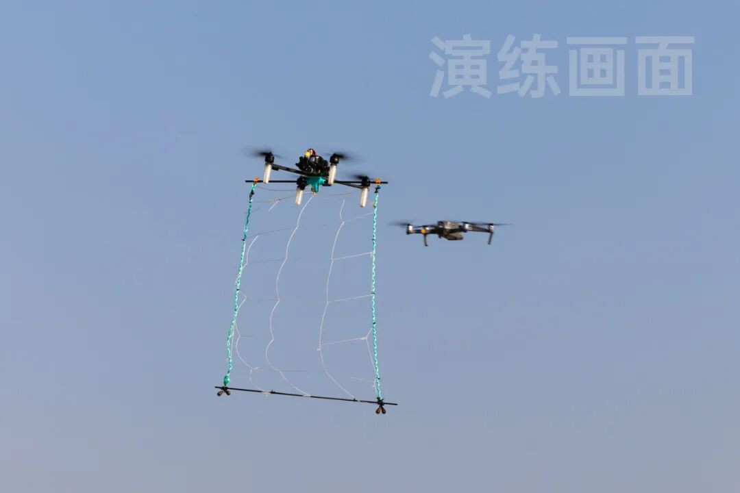 演练还模拟了一架自媒体“黑飞”无人机升空搅扰机场运转的特情。发现“黑飞”后不到1分钟,一架公安无人机带着捕捉网出动,追寻、接近方针无人机,精准捕获。