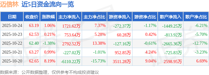 证券之星音讯,到2025年10月24日收盘,迈信林(688685)报收于63.19元,上涨1.06%,换手率2.53%,成交量3.67万手,成交额2.34亿元。